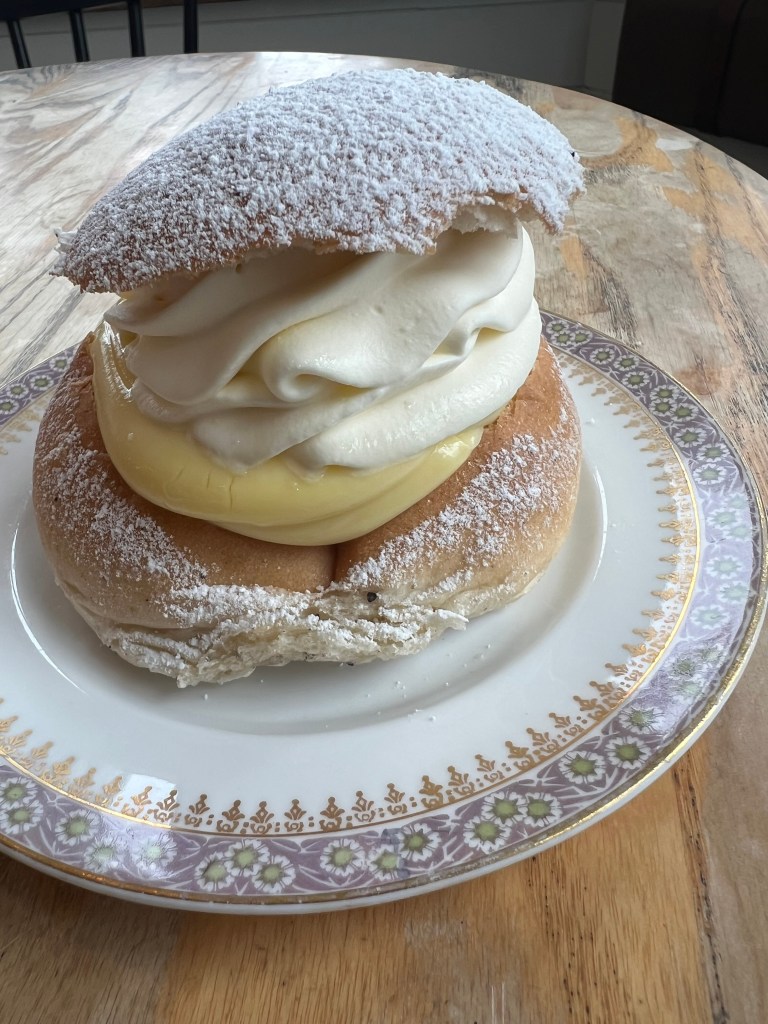 Had to have one today!! A heavy, creamy, vanillafilled heavenly semla! At this time of the year we eat this traditional sweet bun. Normally with allmondfilling, but nowerdays there are varietys with nutella, vanilla (yes, mine today), dulce de leche, cinnamon, chocolate, licorice etc…. Visiting one of my favorite cafés today in Kungshamn on my lunchbrake, I simply could´t leave without a huge semla to finish of my lunch.