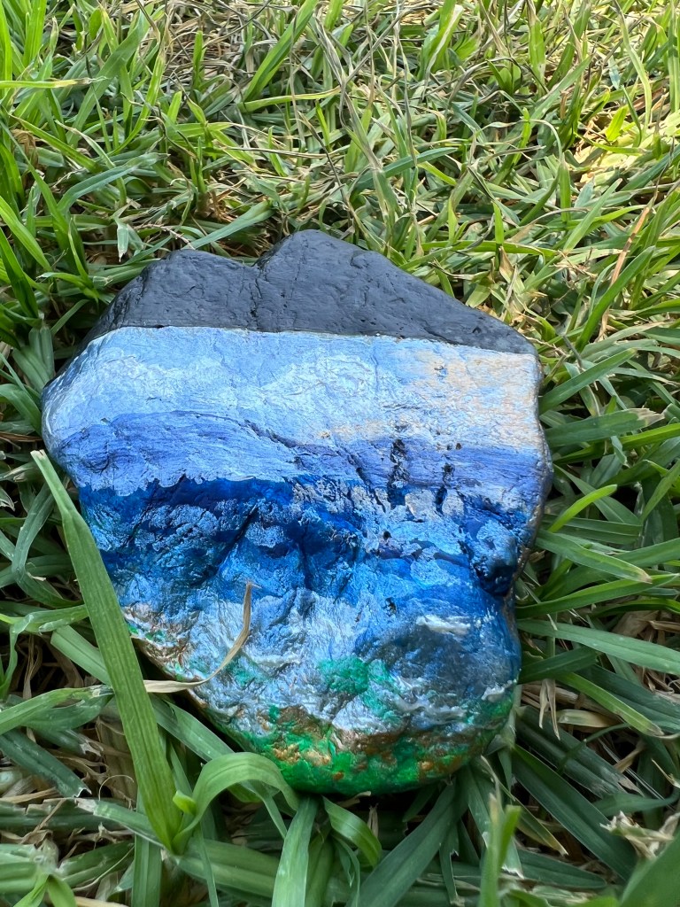 My therapystone symbolizes freedom and fresh air, light and the ability to breathe, illustrating an experience of going from darkness to light, from anxiety and fear to immense joy. The black on the top, deep and suffocating, represents a trap I once found myself ensnared in. In stark contrast, the blue signifies the vast blue sky and serene sea. There I found relief and freedom in breathing fresh air. I will never forget the feeling. I chose to leave the stone where it was created, a deliberate act of letting go, leaving behind and moving on.