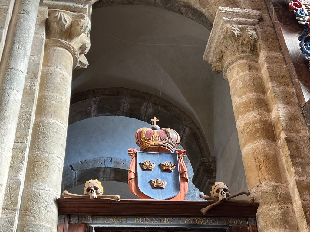 Denna upplysning möter besökaren i Varnhems klosterkyrka, vackert dekorerad med dödskallar och Sveriges riksvapen. I förrgår var jag en av de där besökarna.